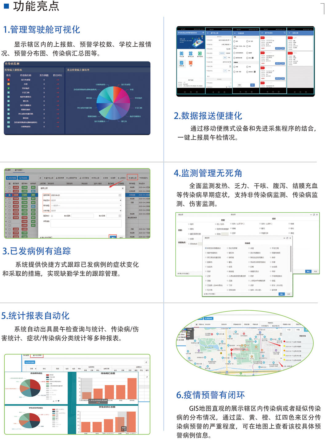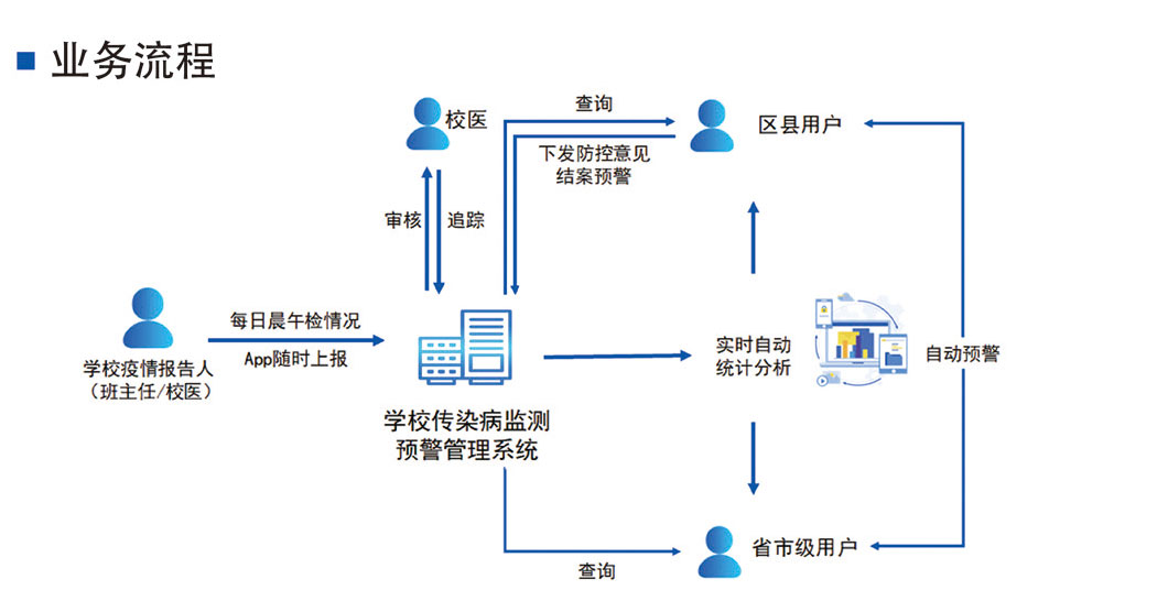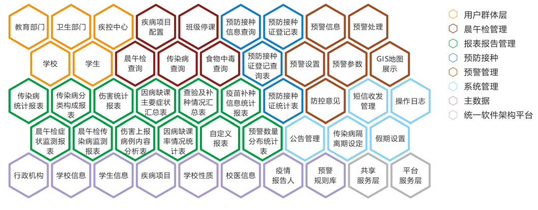 系统服务于学校传染病早期预警监测,为学校传染病疫情和突发公共卫生事件得以早发现、早报告、早控制提供准确、可靠的早期症状数据和预警,使之成为学校传染病监测体系的第一道监测关口。系统支持幼、小、初、高、大学所有学段每日展午检及因病缺勤情况登记、缺勤追踪、自动预警和统计分析等功能,有效提升学校防控传染病的能力。