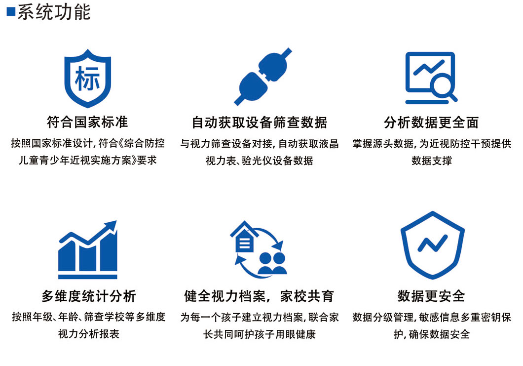 系统参照《儿童青少年近视筛查规范》要求设计,符合 GB11533-2011 国家标准,运用互联网、物联网和移动通信等技术为学生视力体检并建立视力健康档案。支持视力数据采集、查询、评价、预警、统计、分析、存档、诊疗、康复于一体,形成一个儿童青少年风险评估和分级预防信息化体系,实现儿童青少年眼健康的智能化和标准化筛查,提高儿童青少年眼健康数字化管理水平,满足省、市、区县三级监管和考核要求,为深入制定近视防控方法、抑制儿童青少年近视高发、低龄化的趋势,提供科学数据支撑。